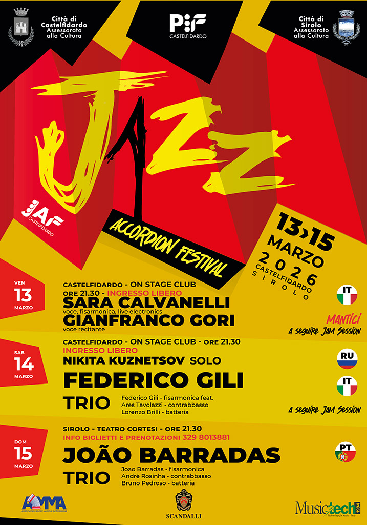 Manifesto JAF 2026Scelte stilistiche chiare, un clima di condivisione e contaminazione, una marcata apertura ai giovani. La nona edizione del Jazz Accordion Festival mantiene l’impronta di qualità che lo caratterizza scodellando un programma di respiro internazionale.