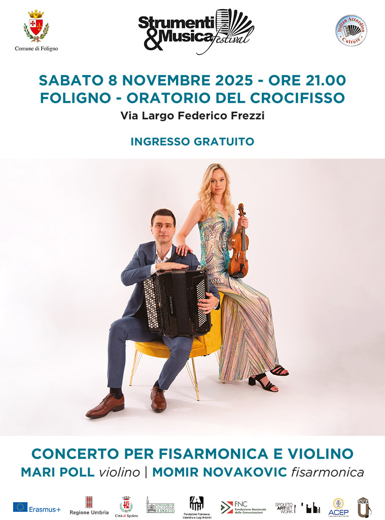 Si (ri)parte sabato 8 novembre da Foligno. Anche questa è una delle novità della XV edizione dell’evento, in quanto il festival si sposta dalla propria sede naturale di Spoleto per abbracciare le città limitrofe. A esibirsi, alle ore 21.00, nel suggestivo Oratorio del Crocifisso, sarà il duo costituito dal fisarmonicista serbo Momir Novakovic e dalla violinista estone Mari Poll, che eseguirà brani di Arvo Pärt, Antonio Vivaldi, Mikołaj Majkusiak, Béla Bartók, Astor Piazzolla e Pablo De Sarasate.